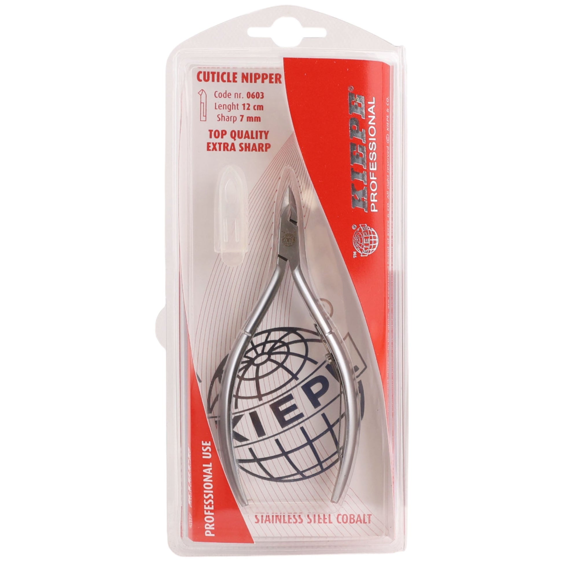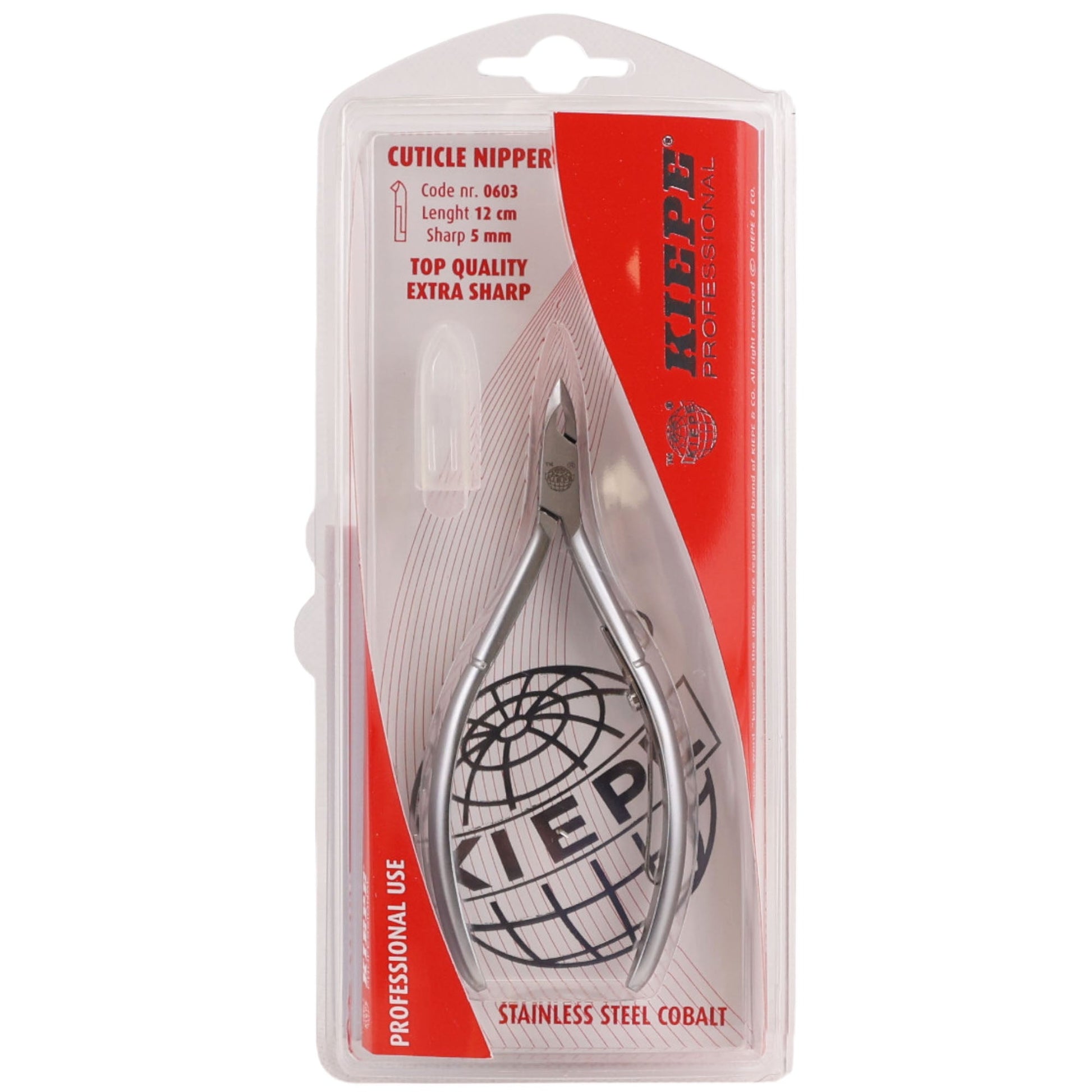 The Kiepe 0603.12 Cuticle Nippers Extra Sharp Stainless Steel Cobalt are crafted for professionals and individuals seeking precise and effective cuticle care. Made from premium cobalt stainless steel, these nippers are hand-sharpened to perfection, offering razor-sharp, angled cutting edges ideal for trimming dead cuticles, hangnails, and tough skin around the nail bed. The ergonomic design features easy-grip handles and a smooth spring mechanism, ensuring controlled and comfortable use for both manicures and pedicures. Their durable construction, combined with a satin finish, guarantees rust resistance and long-lasting performance. With a compact 12cm design, these nippers are portable and convenient, making them suitable for both home and professional use. Regular maintenance, such as oiling the rivet and blades, ensures optimal performance and longevity. These nippers are an essential tool for achieving flawless results in nail care, providing salon-quality precision with every use.